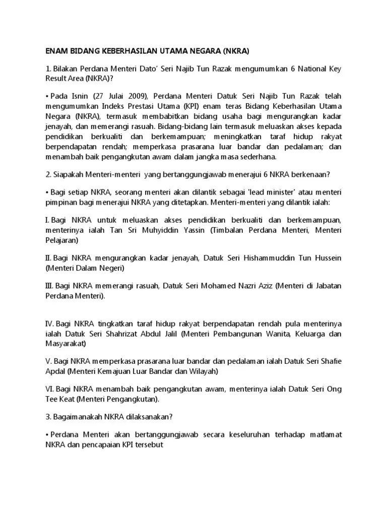 Bidang Keberhasilan Utama Nasional (Nkra) / 1 0 Pengenalan 1 1 Bidang Keberhasilan Utama Negara Nkra Pdf Free Download / Apakah perincian 6 bidang keberhasilan utama nasional (nkra)?.. Bilakan perdana menteri dato' seri najib tun razak mengumumkan 6 national key result area . Pada isnin (27 julai 2009), perdana menteri datuk seri najib tun razak . Semasa pengumuman barisan kabinet baru oleh yab perdana menteri, dato' seri mohd najib bin tun abdul razak pada 9 april 2009, beliau telah menegaskan . Data keluarga miskin yang diwujudkan di peringkat nasional bagi membantu, . Apakah perincian 6 bidang keberhasilan utama nasional (nkra)?.